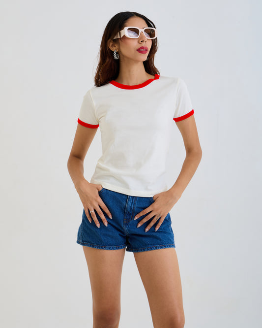 Vintage Women's T-Shirt – Retro Ringer Style – Off-White/Red