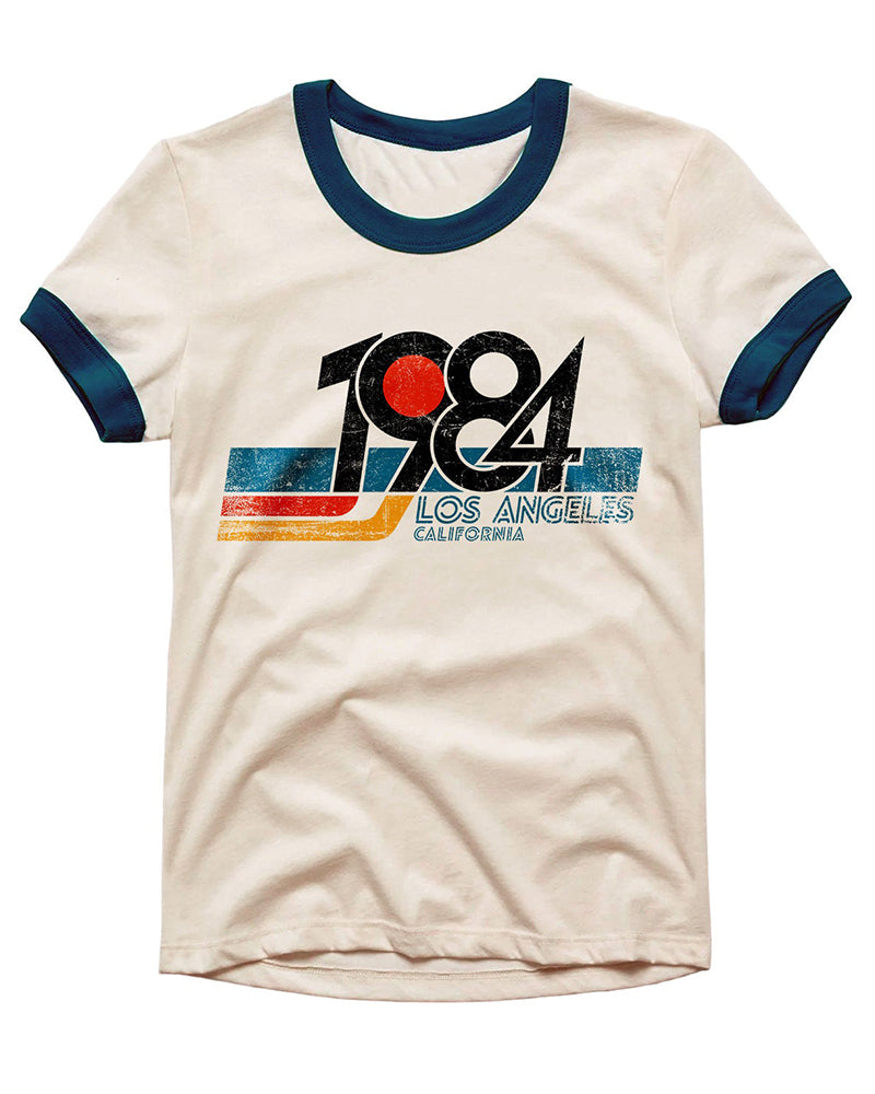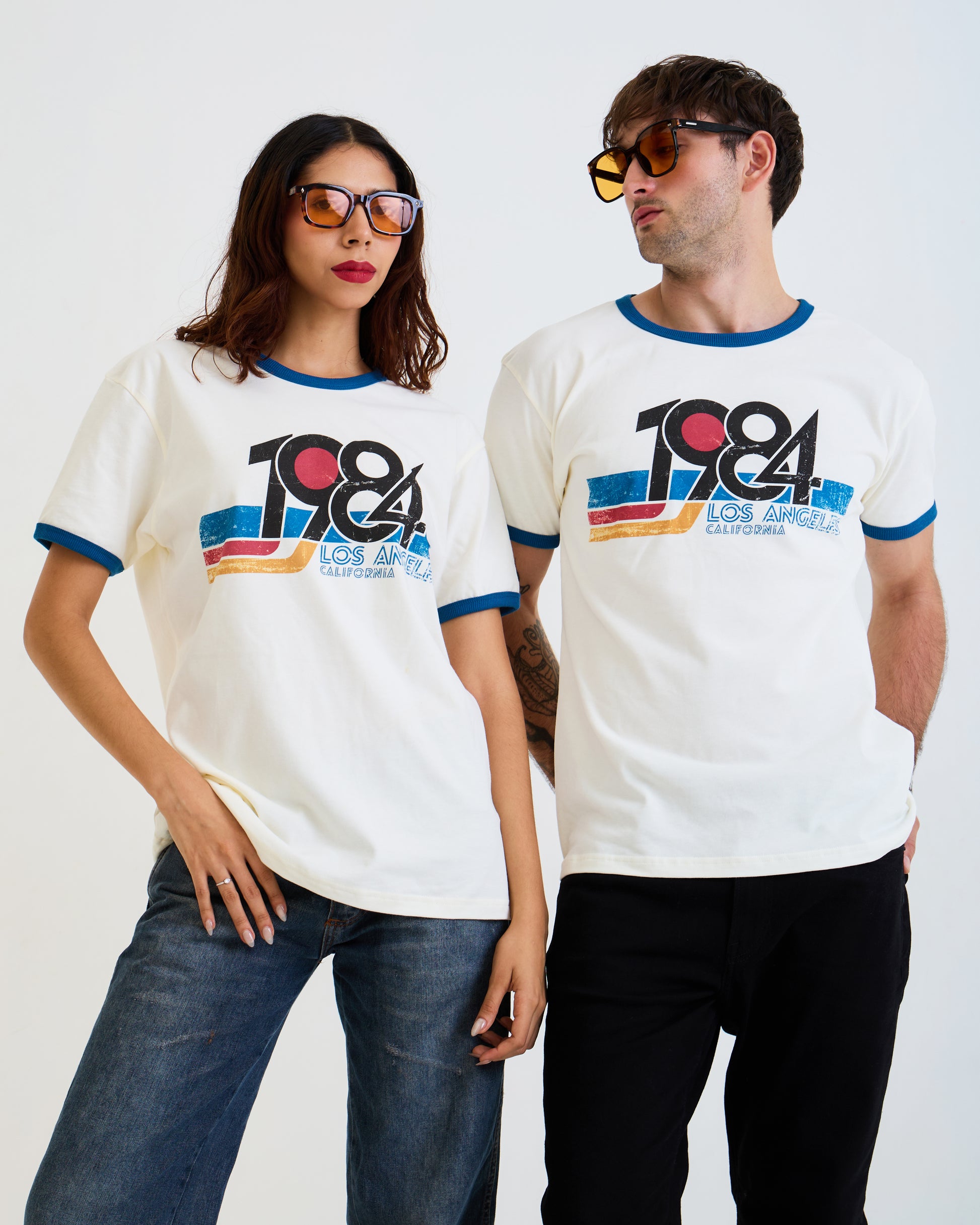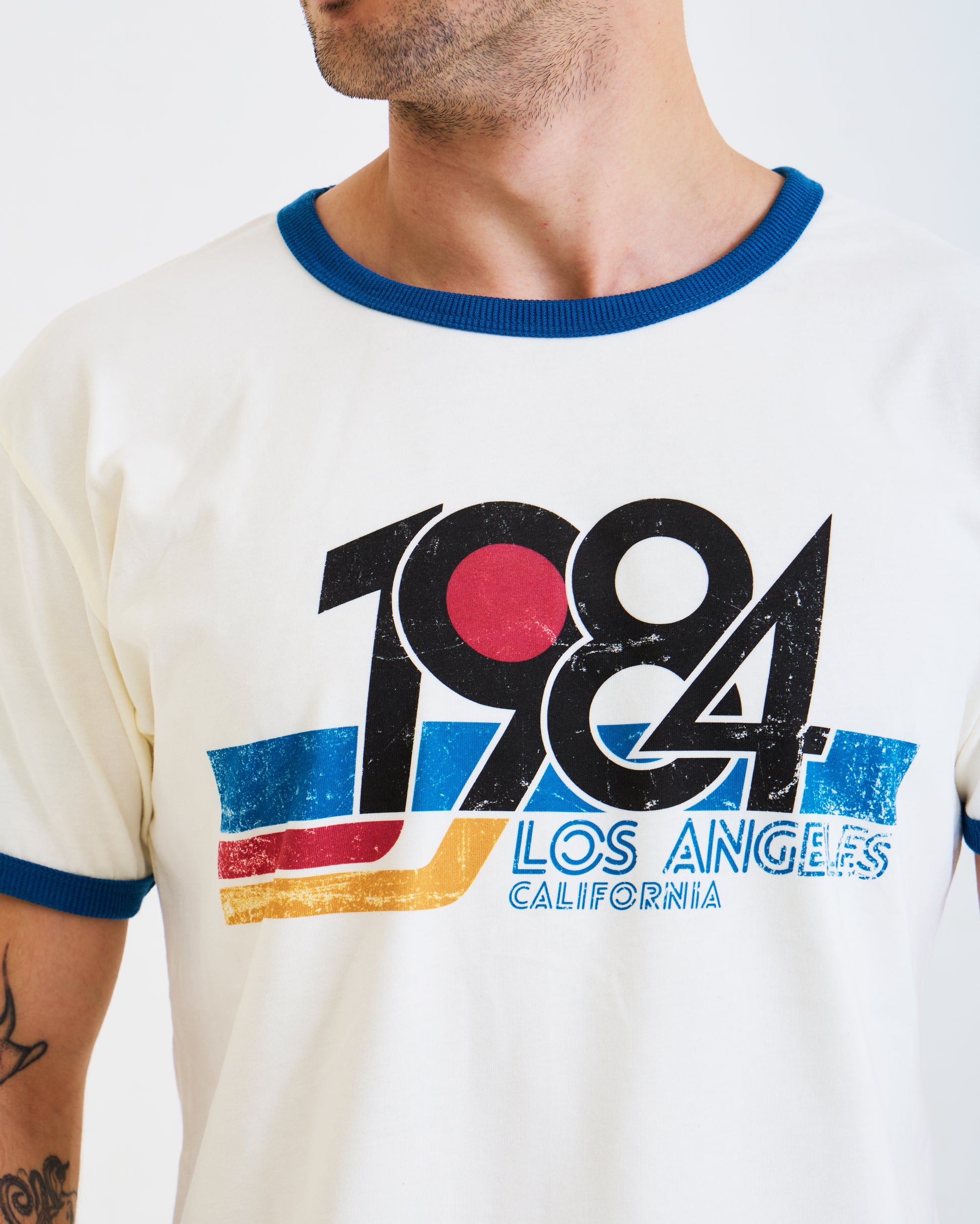 Vintage Unisex T-Shirt – 1984 Los Angeles California Graphic – Retro Ringer Style – Off-White