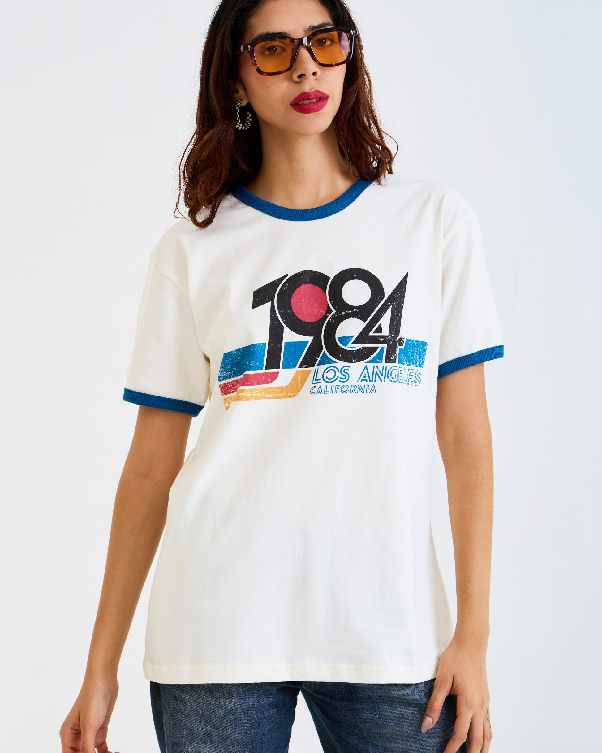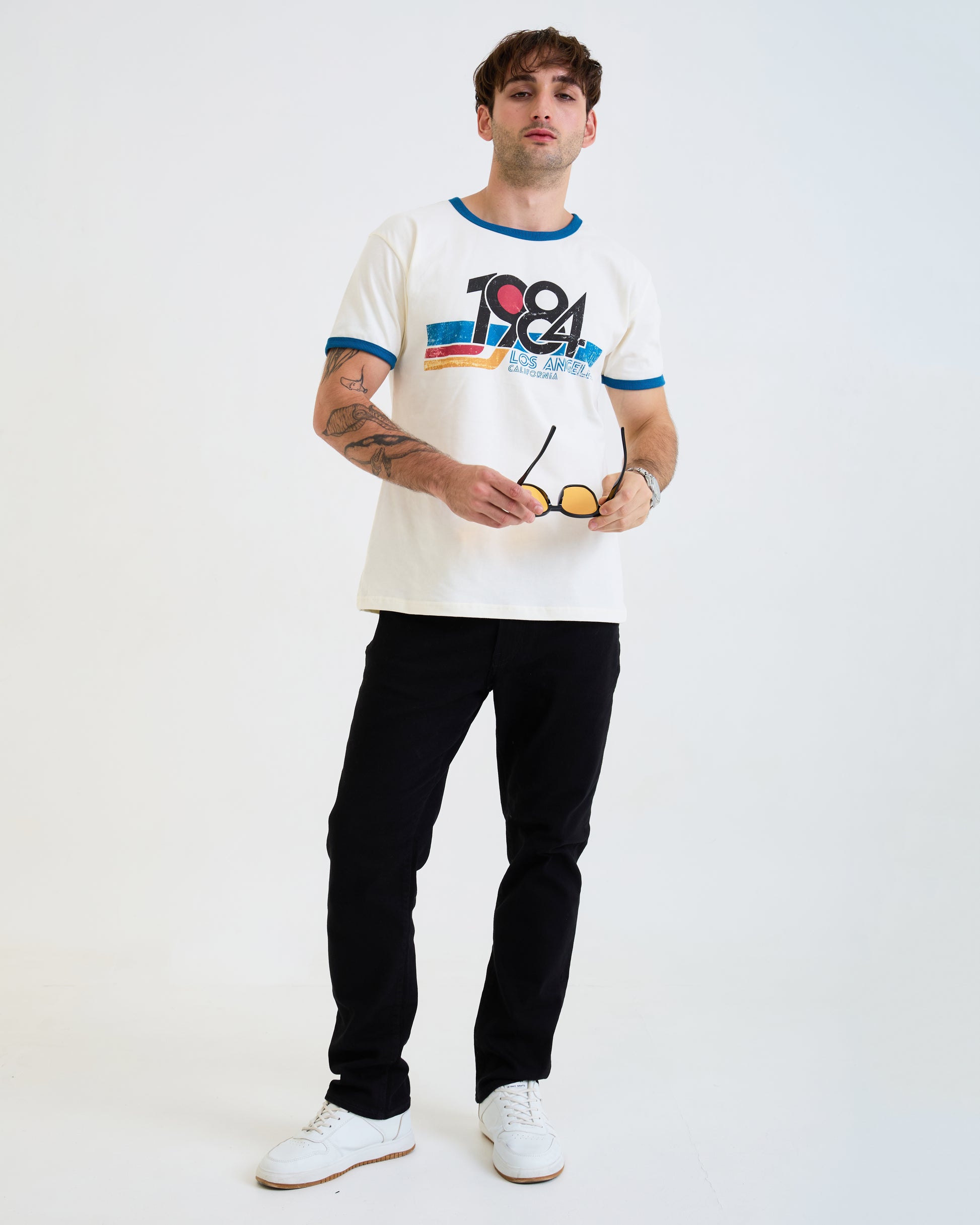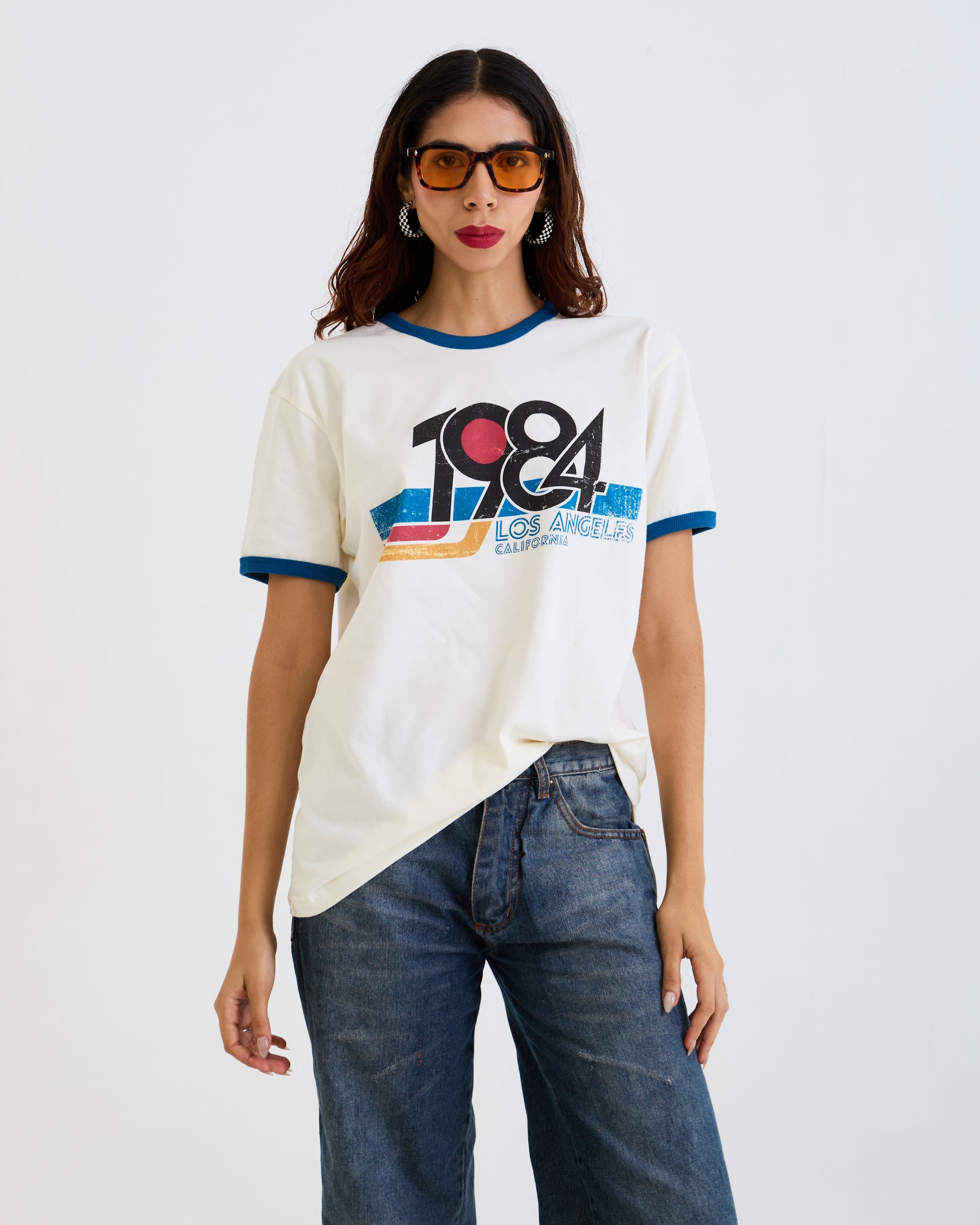 Vintage Unisex T-Shirt – 1984 Los Angeles California Graphic – Retro Ringer Style – Off-White