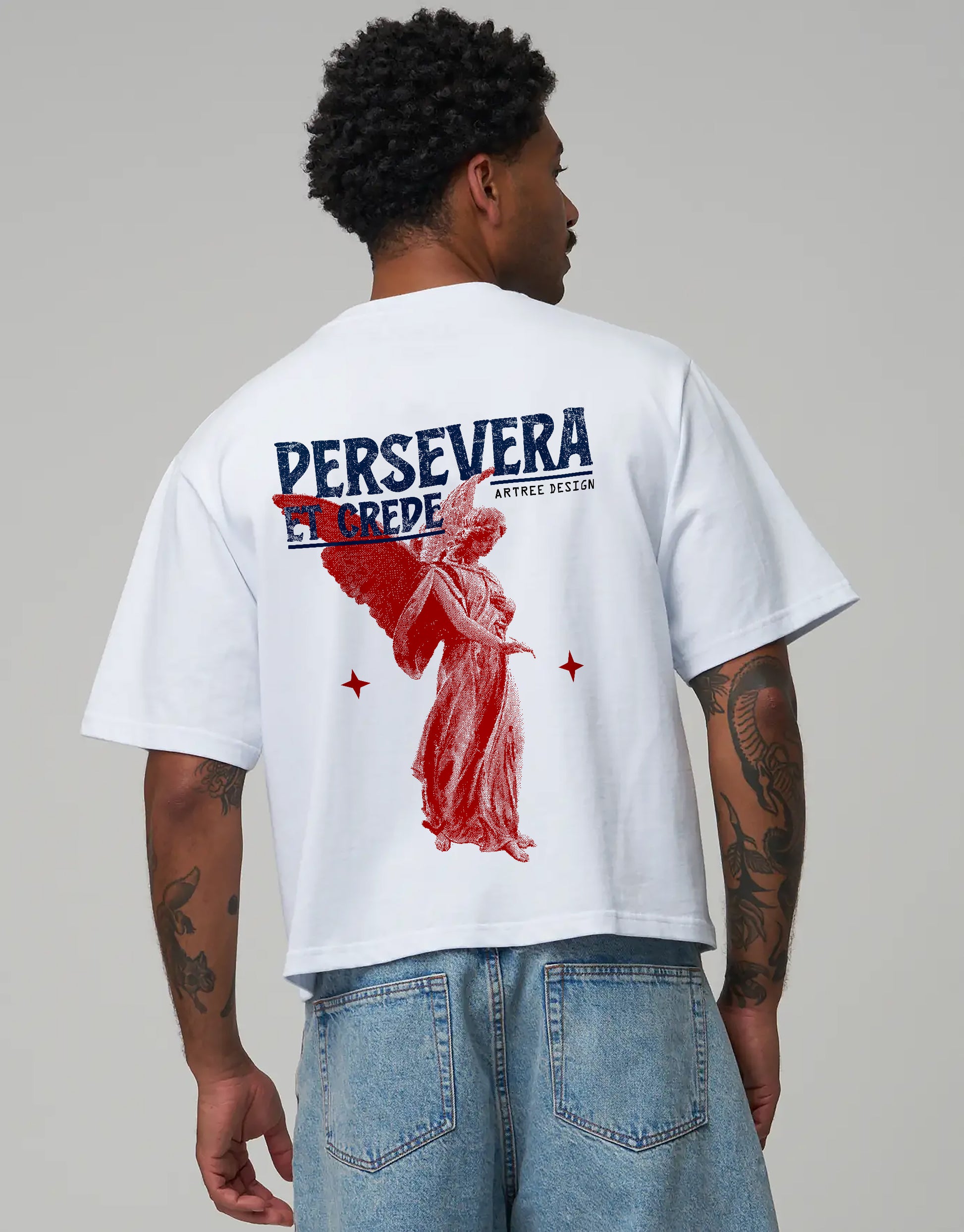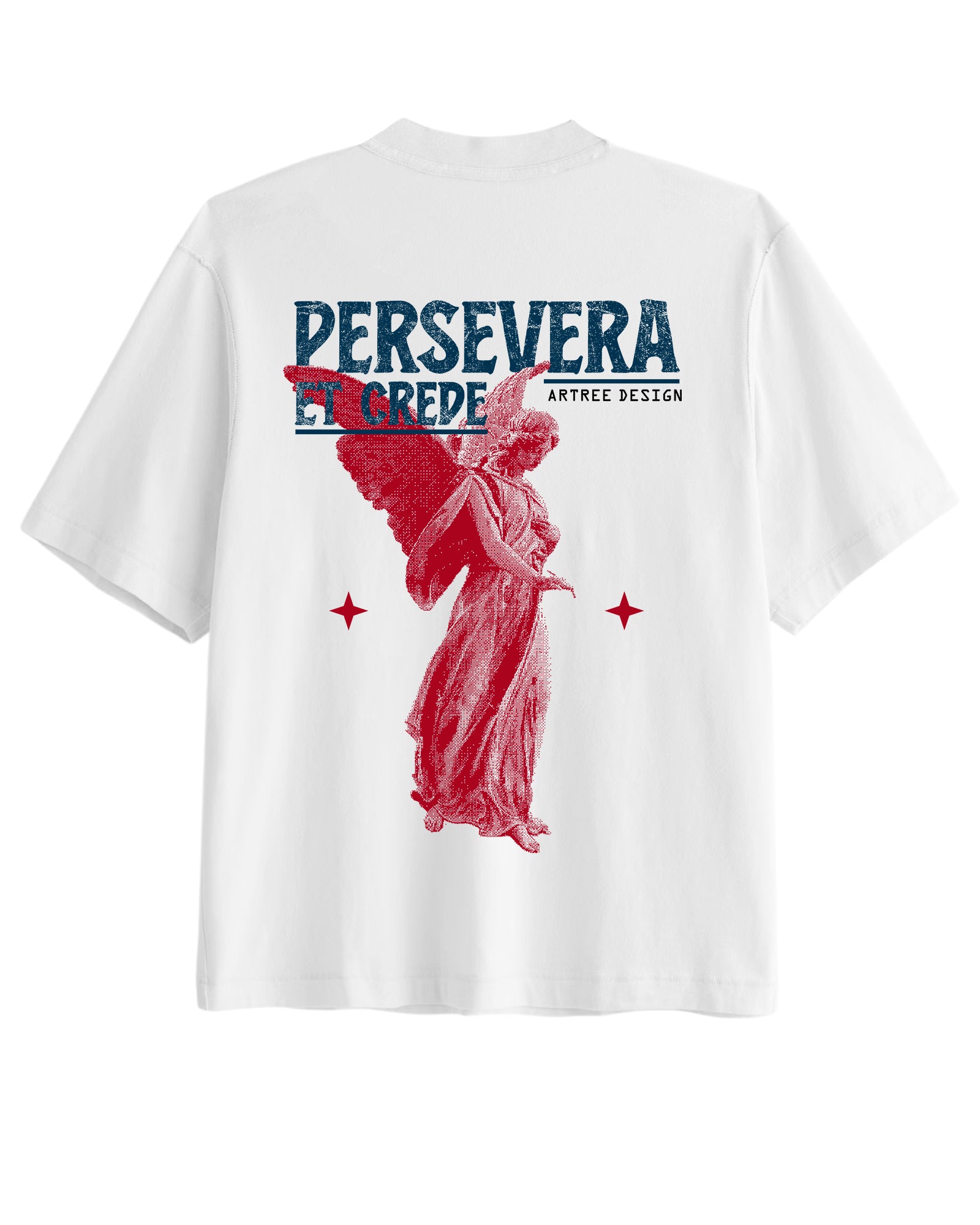 Get the Vintage-Style “Persevera et Crede” (Persevere And Believe) Tee by Artree Design – This cropped unisex t-shirt showcases a striking pixel-art angel graphic paired with classic vintage typography for a bold, nostalgic look. The design blends retro gaming style with motivational spirit, making it both unique and inspiring.