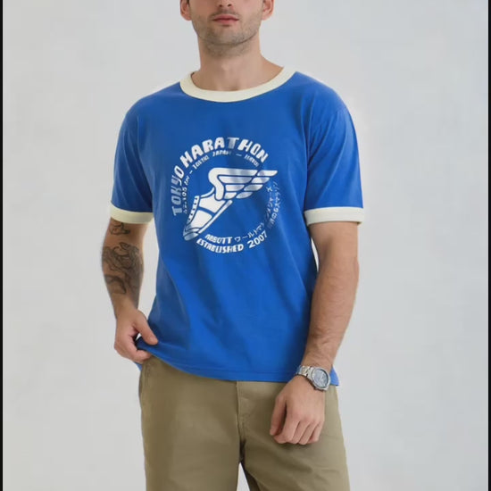 Vintage Unisex T-Shirt – Marathon Running Retro Ringer Style – Blue/White