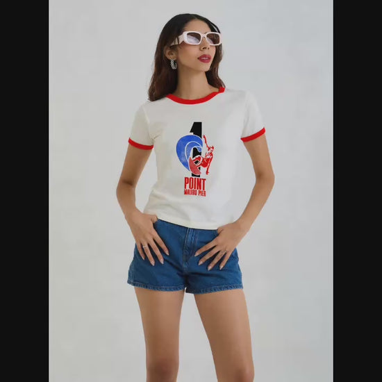 Vintage Women's T-Shirt – 1 Point Malibu Pier Graphic – Retro Ringer Style – Off-White/Red