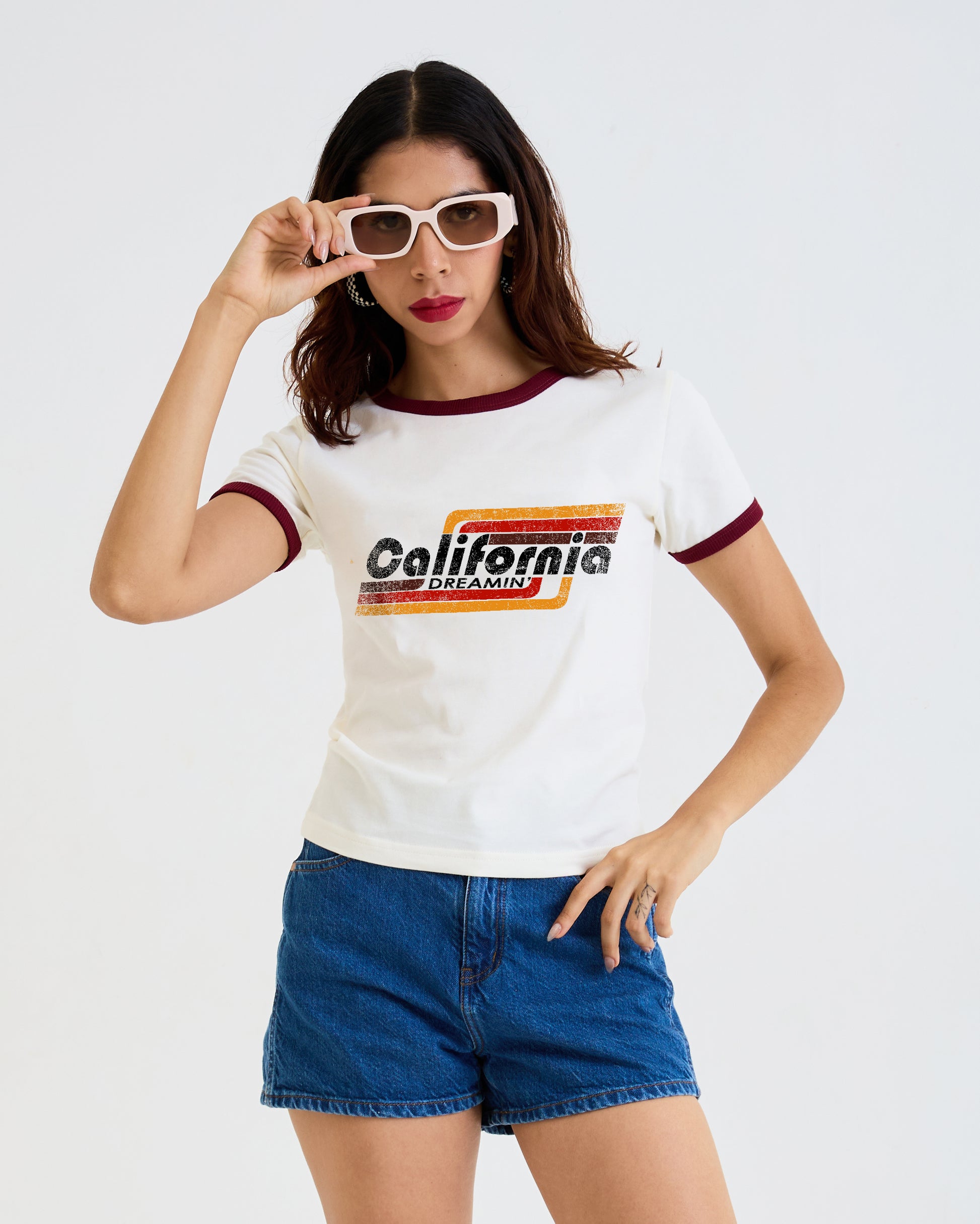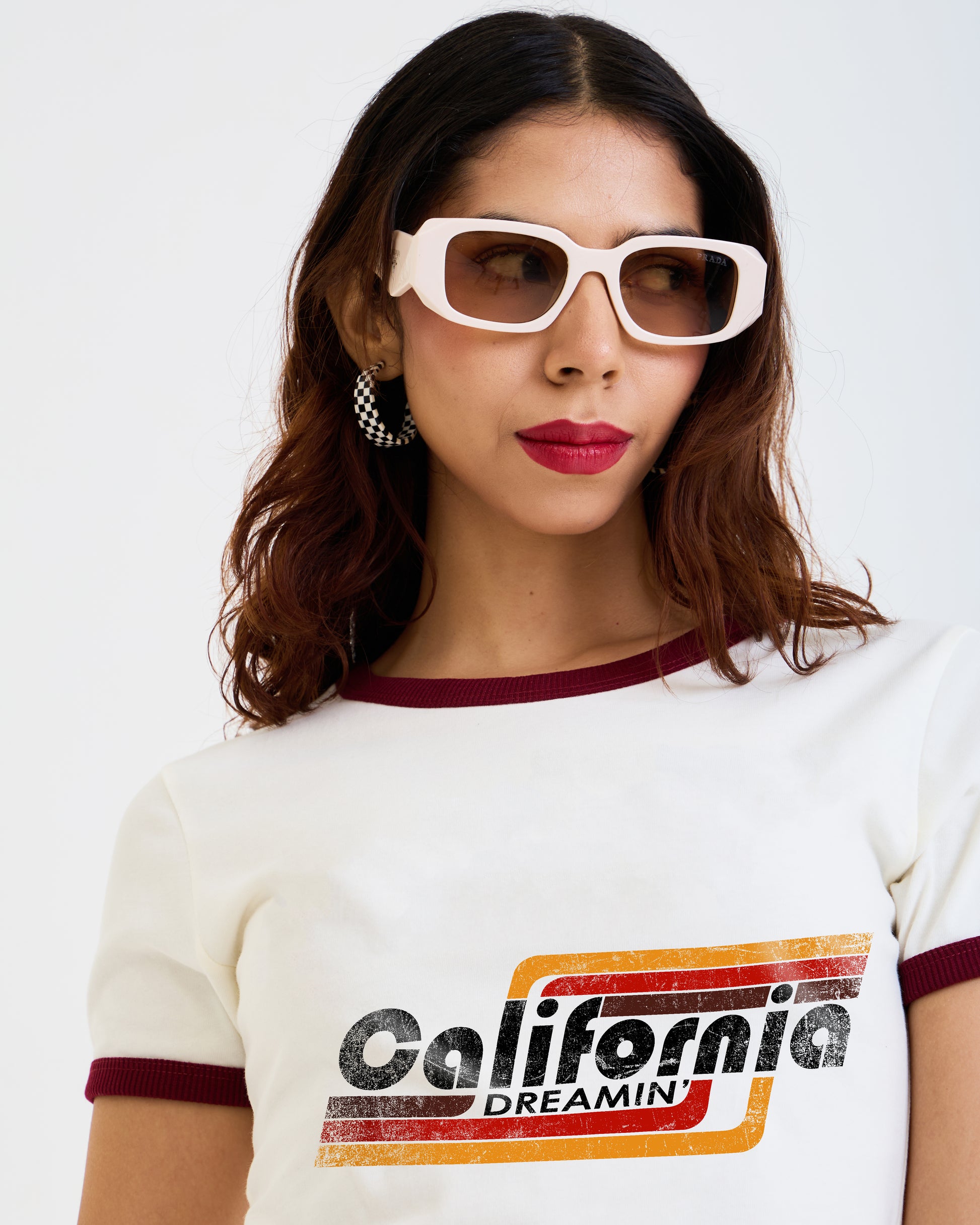 Vintage Women's T-Shirt – California Dreamin Graphic – Ringer Style – Off-White/Red