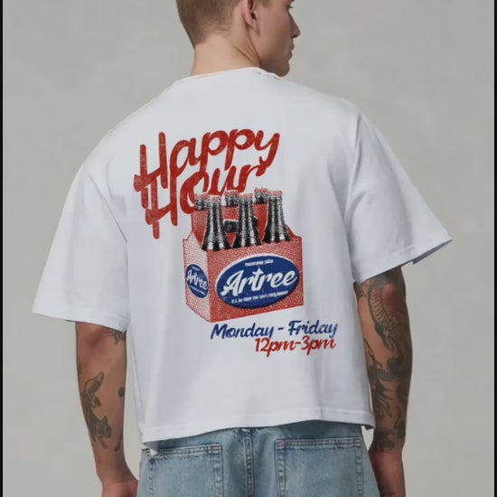 Raise a glass to good times with the Artree “Happy Hour” Tee — a retro-inspired design featuring vintage beer crate artwork and bold halftone print.